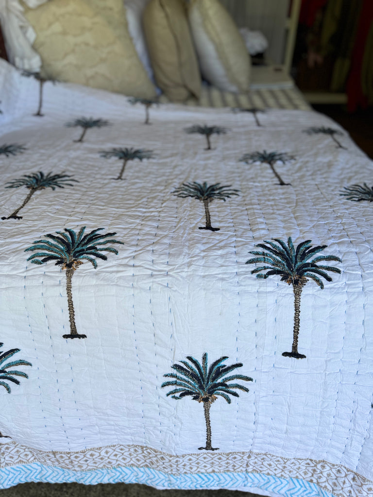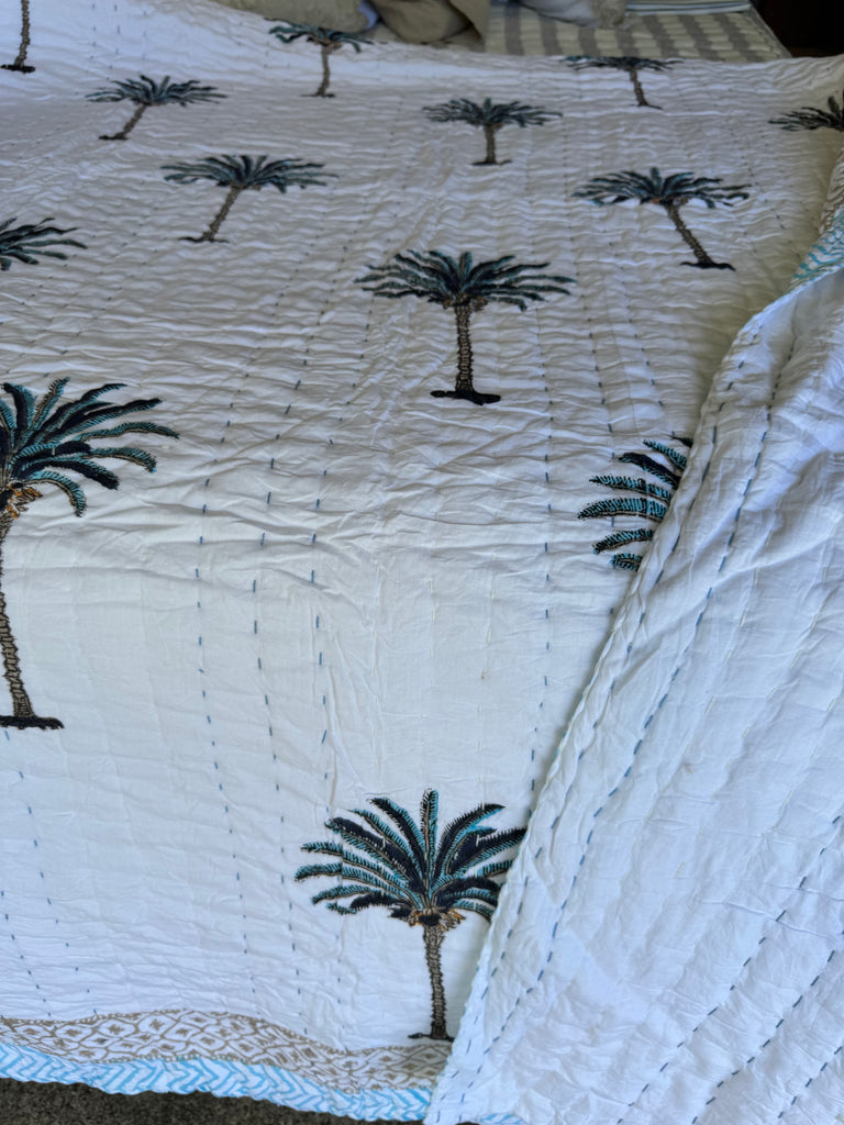 Kantha quilts are a major trend in bed linen right now, made entirely by hand, each quilt is made from bright fabrics & stunning designs. Blue palm design & white on reverse side, lightweight 100% cotton quilt. Slightly padded with 100% cotton fill.