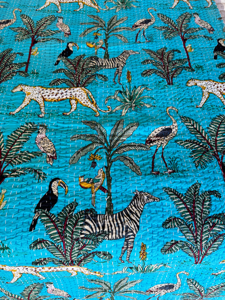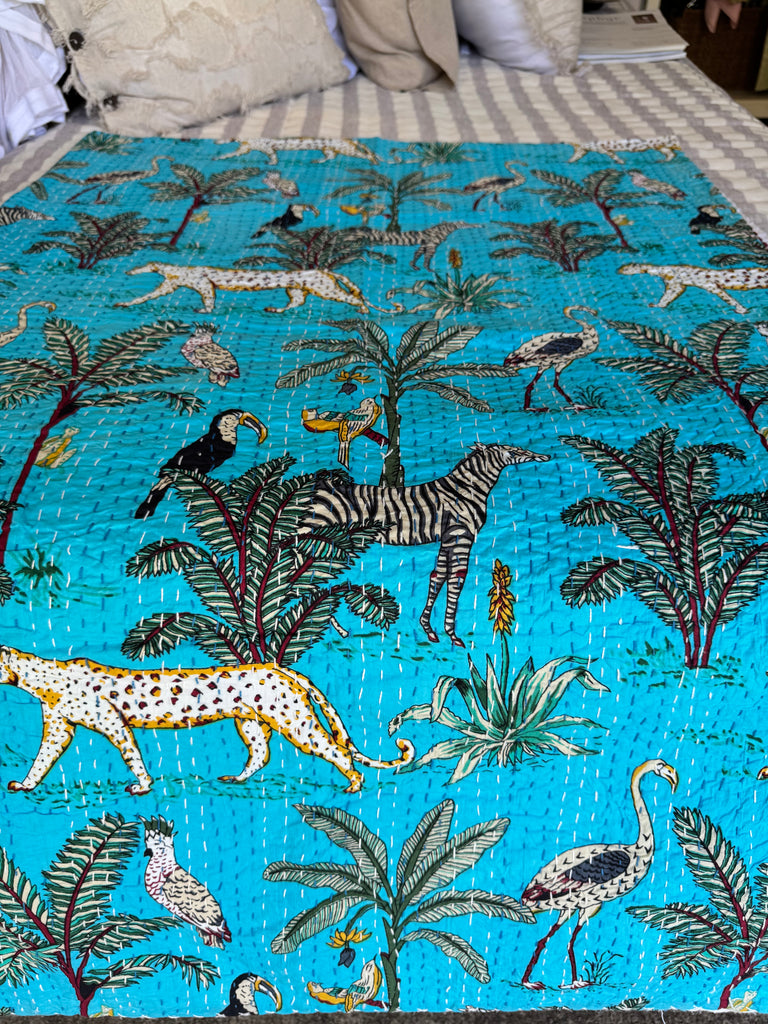 These quilts are hand-crafted in the Rajasthan region of India, and feature Kantha stitching (a simple running stitch).