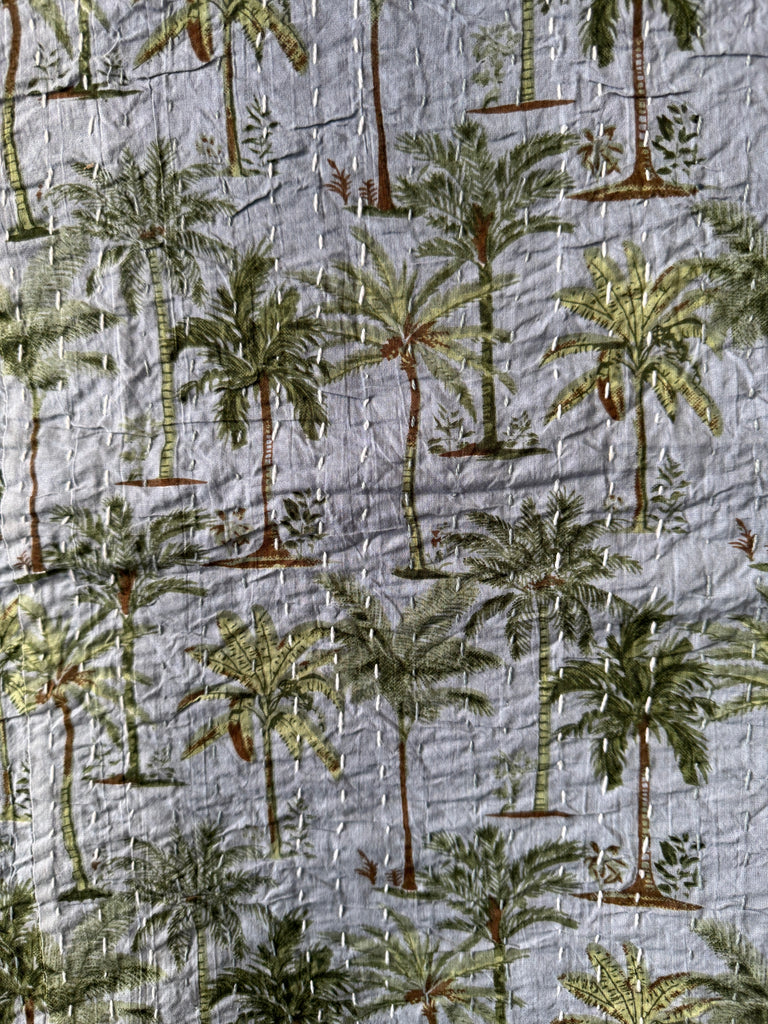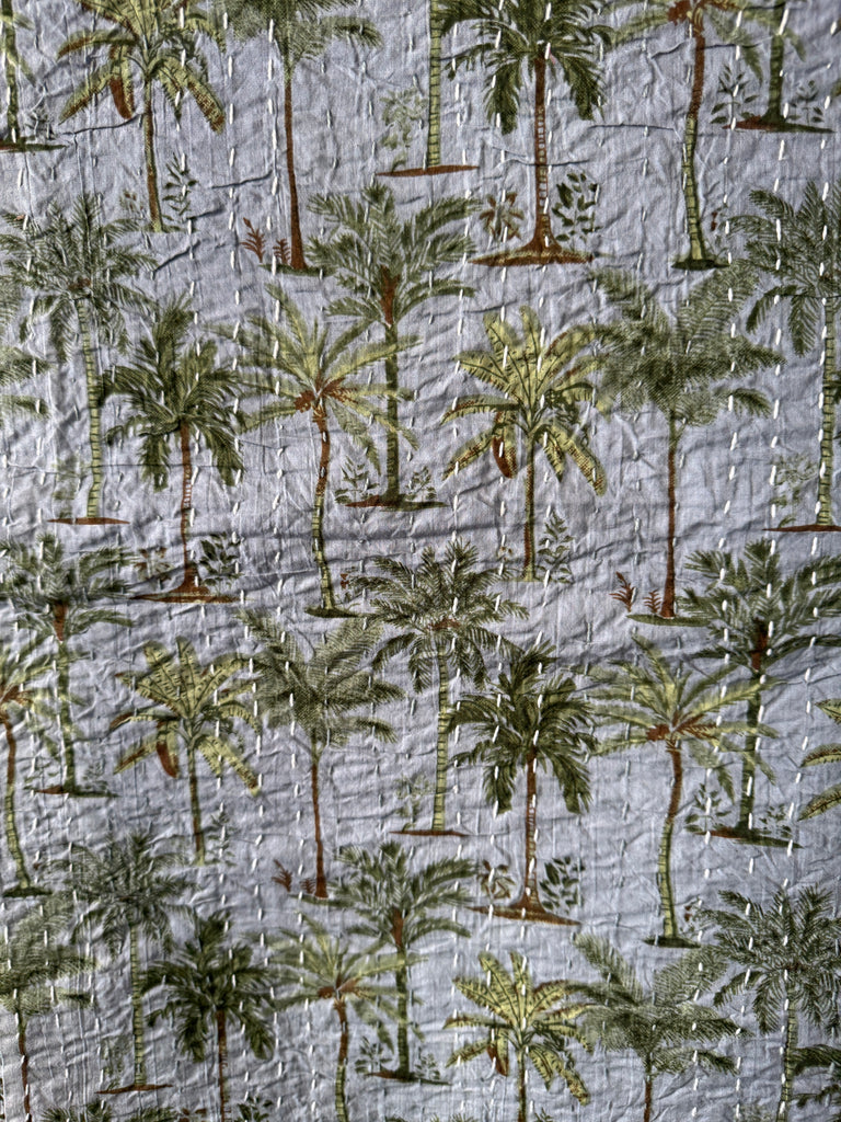 Suitable as a stunning quilt for your bed, a throw over your couch, or doubled over as a decorative end-of-bed throw. These quilts are hand-crafted in the Rajasthan region of India, and feature Kantha stitching (a simple running stitch).