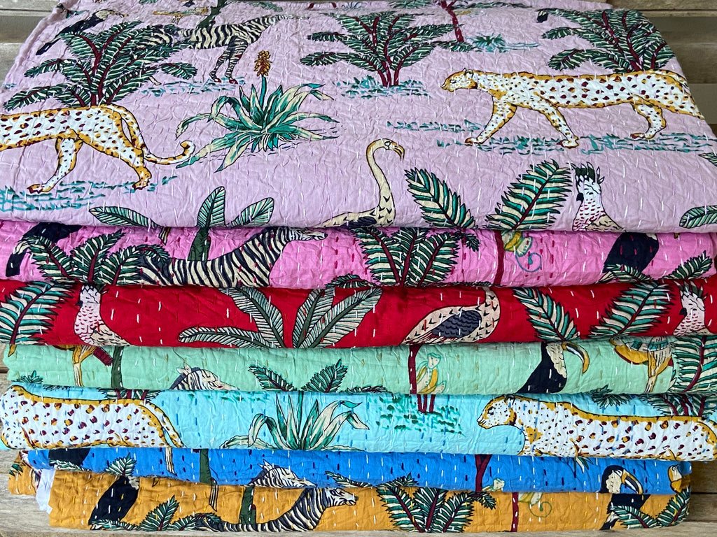 These quilts are hand-crafted in the Rajasthan region of India, and feature Kantha stitching (a simple running stitch).
