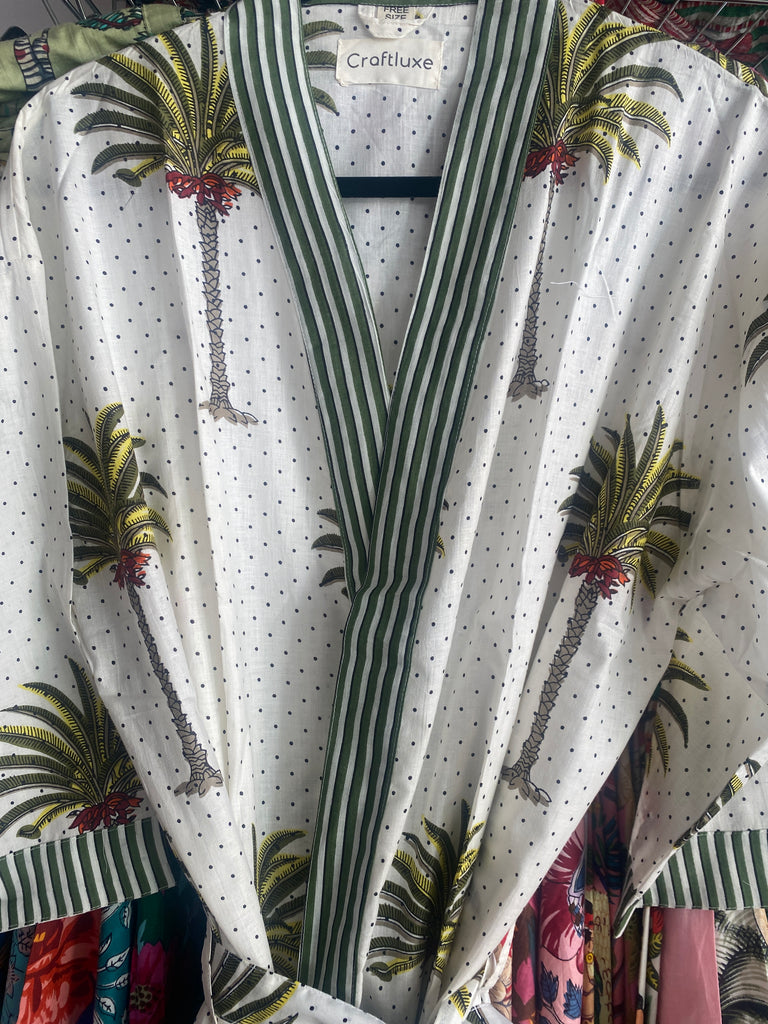 Beautiful kimono style dressing gowns. Made of printed 100% cotton, ideal for traveling and overnight stays. The kimono have side pockets, inside tie and a belt tie for the waist with belt loops. One size fits all (size 8 -16) , approx 125cm in length.  Perfect for the summer months, a kimono, bath robe or a robe for the beach.