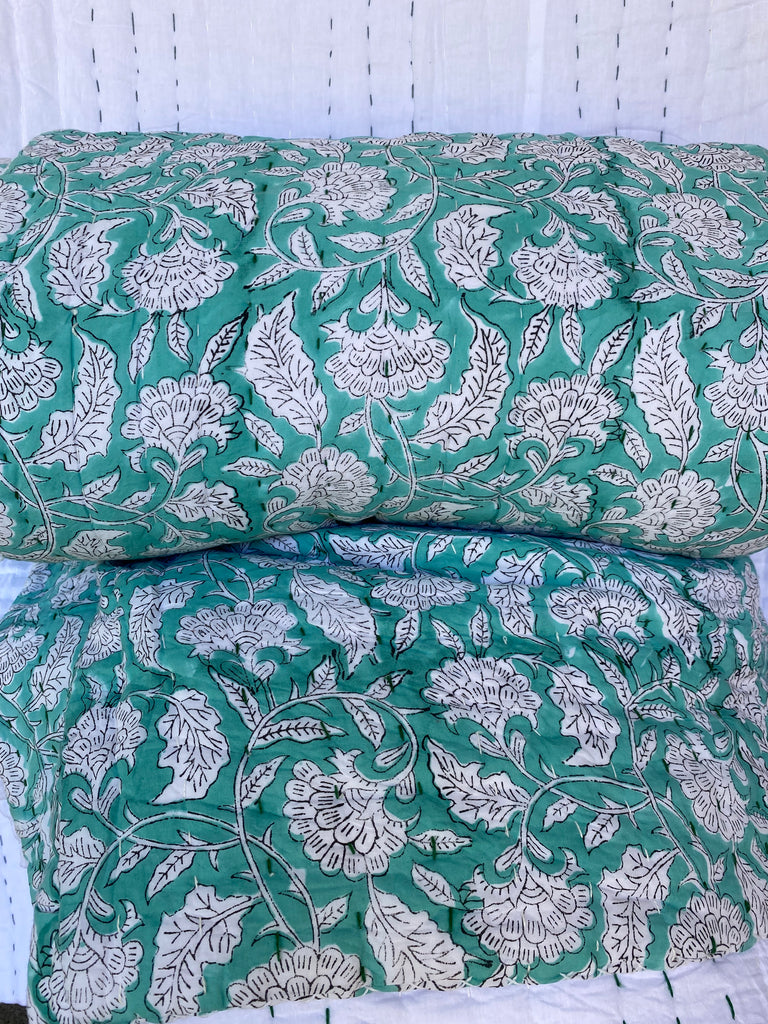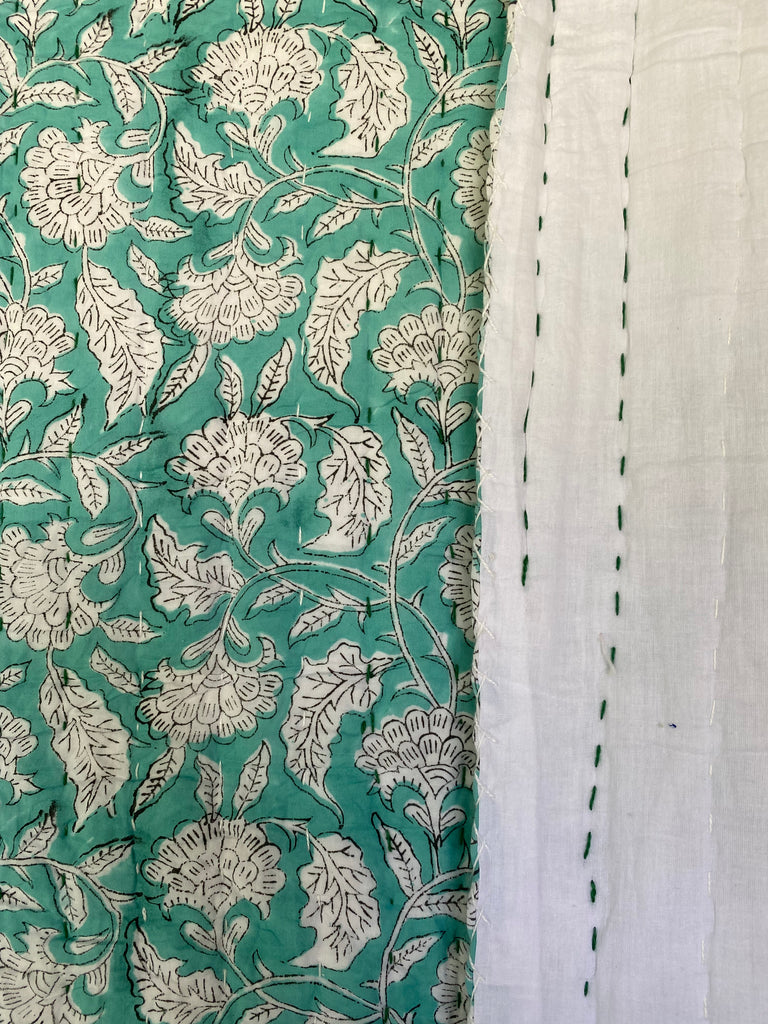 These quilts are hand-crafted in the Rajasthan region of India, and feature Kantha stitching (a simple running stitch).